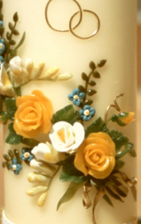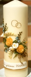 Jubiläumskerze, mit einem schönen, diagonal aufgelegten Blumenornament mit gelben Rosen, blauen Vergißmeinnicht und weißen Freesien. Oberhalb der Blumen befinden sich die goldfarbenen Ringe und unterhalb des Motivs steht auf einem weißen Wachsband die Aufschrift „Zur goldenen Hochzeit“.