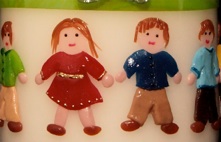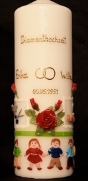 Jubiläumskerze, diese schöneJubiläumskerze ist eine Sonderanfertigung der besonderen Art. Unter den Namen der Jubilare sind, in Bilderrahmen eingefasst, Symbole für die ehemaligen Berufe der beiden. Unterhalb des Datums ziert ein feines Rosenornament das Motiv. Die fröhliche Kinderschar am unteren Ende der Kerze zeigt, über wieviele Enkel sich das Jubelpaar freuen darf.