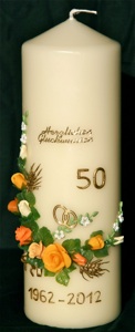 Hier finden Sie Beispiele von Jubiläumskerzen für die Silberhochzeit, Goldene Hochzeit, Diamantene Hochzeit etc. mit schönen Blumenmotiven und individueller Beschriftung.