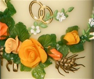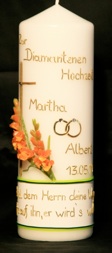 Jubiläumskerze, mit goldfarbenem Kreuz, die Namen der Jubilare, Datum, Trauspruch, und der Aufschrift „Zur Diamantenen Hochzeit“. Zwischen den Namen stehen zwei goldfarbene Ringe mit zwei kleinen Straßsteinchen. Zwei üppig blühende, orangefarbene Gladiolen zieren das Motiv.
