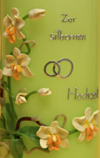 Jubiläumskerze, mit wunderschönem Ornament aus Orchideen in creme. Zwei silberne Ringe und die Aufschrift „ Zur silbernen Hochzeit „ stehen in der Mitte der Kerze. Zwei dezente Goldstreifen entlang der Blumen runden das Motiv perfekt ab.