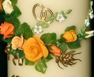 Jubiläumskerze, mit halbrund angelegten Blumenkränzchen aus Rosen in creme, gelb, orange, weißen Blümchen und goldenen Fruchtähren.