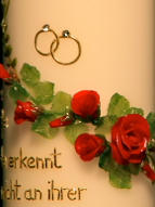Jubiläumskerze, mit schönem Blumenmotiv in rot, leicht diagonal angelegt. Oberhalb der Blumen steht die Aufschrift „Zur Diamantenen Hochzeit“ und zwei Ringe mit Steinchen. Darunter wurde ein Spruch aus goldfarbenen Wachsstreifen von Hand aufgelegt.